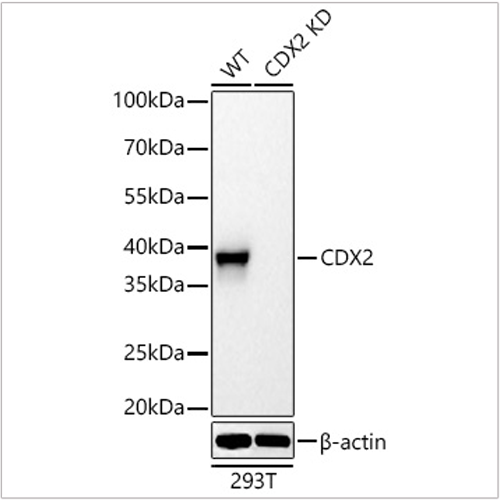 ![]() | Western blot analysis of lysates from wild type (WT) and CDX2 knockdown (KD) 293T cells using CDX2 Rabbit pAb (A1629) at 1:1000 dilution incubated overnight at 4℃. Secondary antibody: HRP-conjugated Goat anti-Rabbit IgG (H+L) (AS014) at 1:10000 dilution. Lysates/proteins: 25 μg per lane. Blocking buffer: 3% nonfat dry milk in TBST. Detection: ECL Basic Kit (RM00020). Exposure time: 10s. |