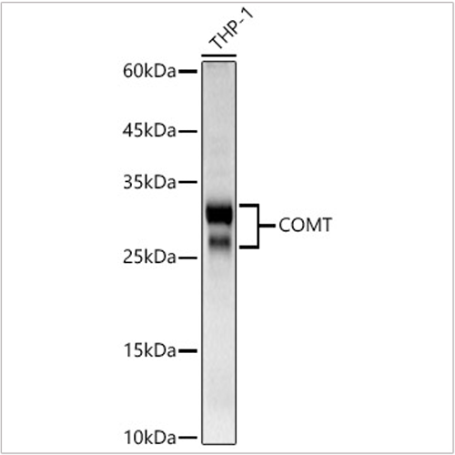 ![]() | Western blot analysis of lysates from THP-1 cells using [KD Validated] COMT Rabbit pAb (A23600) at 1:700 dilution. Secondary antibody:HRP Goat Anti-Rabbit IgG (H+L)( AS014) at 1:10000 dilution. Lysates/proteins: 25 μg per lane. Blocking buffer: 3% nonfat dry milk in TBST. Detection: ECL Basic Kit (RM00020). Exposure time: 10s. |
