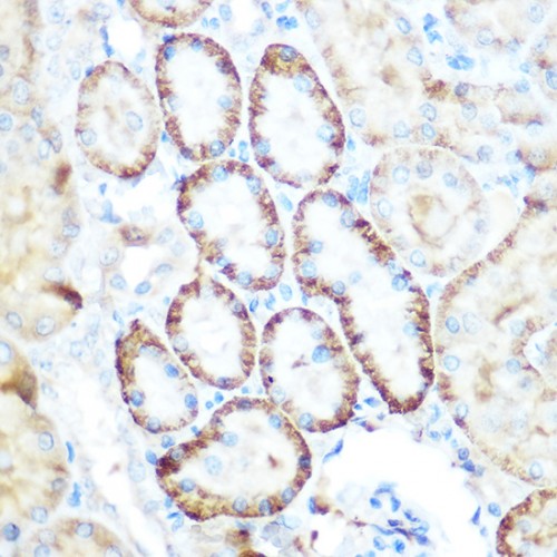 Immunohistochemistry analysis of paraffin-embedded Mouse kidney using [KO Validated] PEPCK/PCK2 Rabbit pAb (A21529) at dilution of 1:100 (40x lens). Microwave antigen retrieval performed with 0.01M Tris/EDTA Buffer (pH 9.0) prior to IHC staining.