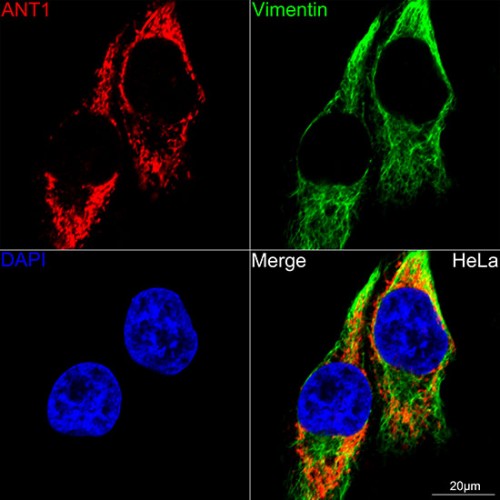 ![]() | Confocal imaging of HeLa cells using [KO Validated] SLC25A4/ANT1 Rabbit mAb (A20842, dilution 1:100) (Red). The cells were counterstained with [KO Validated] Vimentin Rabbit mAb (A19607, dilution 1:100) (Green). DAPI was used for nuclear staining (blue). Objective: 60x. |