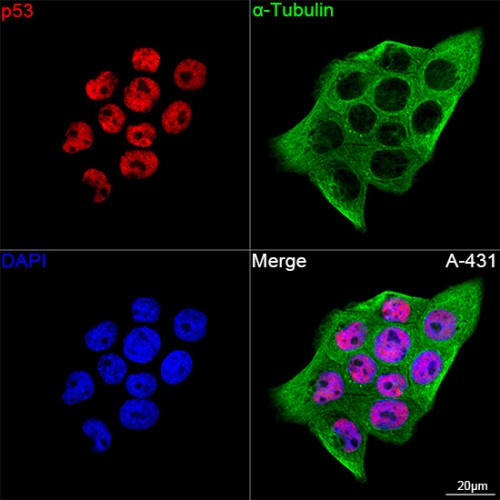 ![]() | Confocal imaging of A-431 cells using [KO Validated] p53 Rabbit PolymAb® (A26037PM, dilution 1:200) followed by a further incubation with Cy3 Goat Anti-Rabbit IgG (H+L) (AS007, dilution 1:500) (Red). The cells were counterstained with α-Tubulin Mouse mAb (AC012, dilution 1:400) followed by incubation with ABflo® 488-conjugated Goat Anti-Mouse IgG (H+L) Ab (AS076, dilution 1:500) (Green). DAPI was used for nuclear staining (Blue). Objective: 100x. |