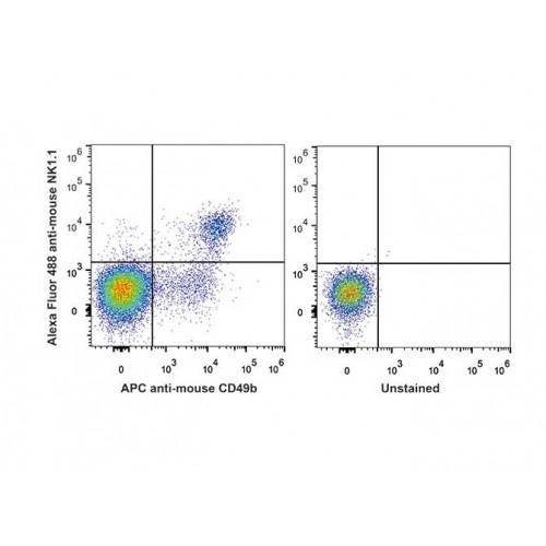 | Background: | NK-1.1 surface antigen, also known as CD161b/CD161c and Ly-55, is encoded by the NKR-P1B/NKR-P1C gene. It is expressed on NK cells and NK-T cells in some mouse strains, including C57BL/6, FVB/N, and NZB, but not AKR, BALB/c, CBA/J, C3H, DBA/1, DBA/2, NOD, SJL, and 129. Expression of NKR-P1C antigen has been correlated with lysis of tumor cells in vitro and rejection of bone marrow allografts in vivo. NK-1.1 has also been shown to play a role in NK cell activation, IFN-γ production, and cytotoxic granule release. NK-1.1 and DX5 are commonly used as mouse NK cell markers. |