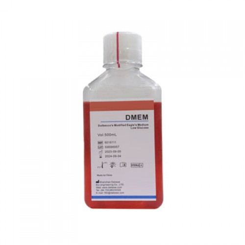 Dulbecco's Modified Eagle's Medium (DMEM) is a modified Eagle Basal cell medium (BME) containing four times the concentration of amino acids and vitamins. This product is a low-glucose type (1000 mg/L) and supports the cultivation of various mammalian cells, including primary fibroblasts, neurons, gliocytes, HUVECs and smooth muscle cells, as well as cell lines such as HeLa, 293, Cos-7 and PC-12. This product is a GMP grade medium without animal-derived components. Therefore, additional culture additives such as fetal bovine serum (FBS) need to be supplemented when culturing cells.
