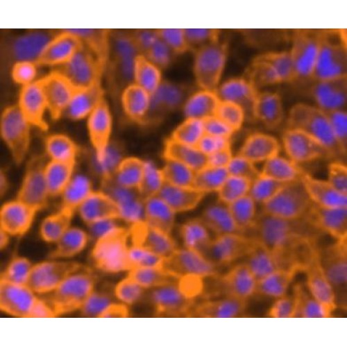 DiI is an orange-red fluorescent, lipophilic carbocyanine and widely used as a long-term tracer for neuronal and other cells. It is weakly fluorescent in water but highly fluorescent when incorporated into membranes. Once applied to cells, the dye diffuses laterally to stain the entire cell.