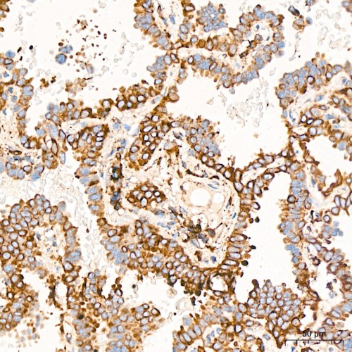 ![]() | Immunohistochemistry analysis of paraffin-embedded Human thyroid cancer tissue using [KD Validated] Calreticulin Rabbit mAb (A20986) at a dilution of 1:2000 (40x lens). High pressure antigen retrieval performed with 0.01M Citrate Bufferr (pH 6.0) prior to IHC staining. |