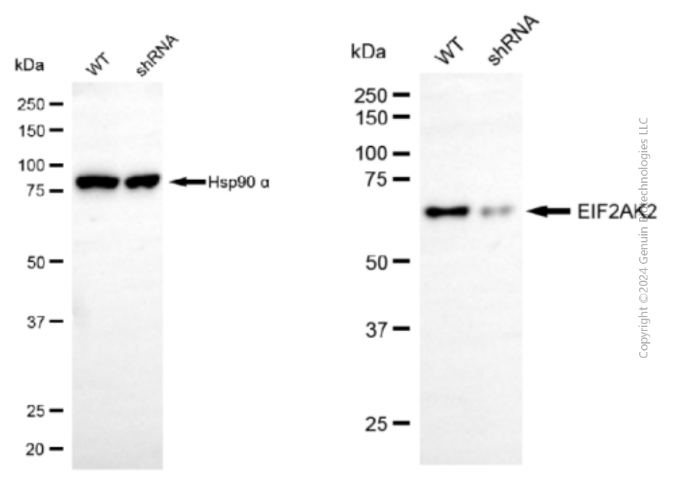 ![]() | Western blotting analysis using anti-EIF2AK2 antibody (Cat#63491). EIF2AK2 expression in wild type (WT) and EIF2AK2 shRNA knockdown (KD) HeLa cells with 20 μg of total cell lysates. Hsp90 α serves as a loading control. The blot was incubated with anti-EIF2AK2 antibody (Cat#63491, 1:5,000) and HRP-conjugated goat anti-mouse secondary antibody (Cat#101, 1:20,000) respectively. Image was developed using NaQ™ ECL Substrate Kit (Cat#716). |