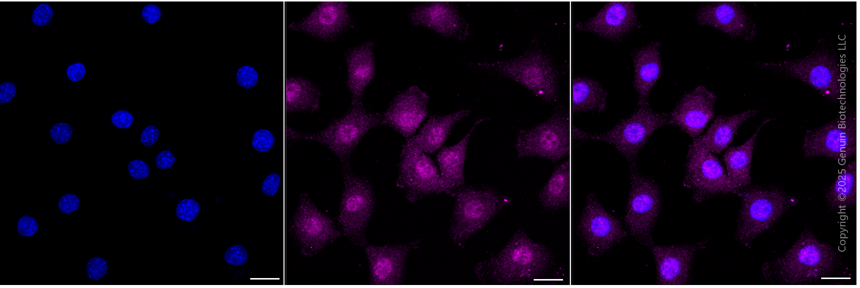 ![]() | Immunocytochemical staining of C2C12 cells with anti-EIF4EBP1 antibody (Cat#63184, 1:1,000). Nuclei were stained blue with DAPI; EIF4EBP1 was stained magenta with Alexa Fluor® 647. Images were taken using Leica stellaris 5. Protein abundance based on laser Intensity and Smart Gain: Medium. Scale bar, 20 μm. |