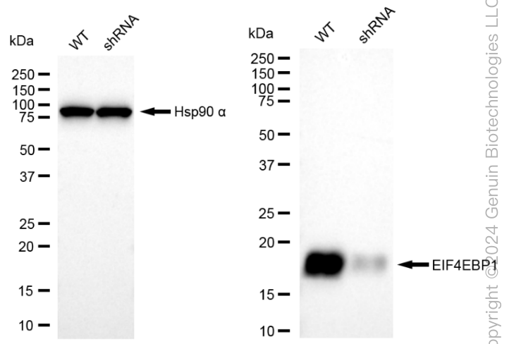 ![]() | Western blotting analysis using anti-EIF4EBP1 antibody (Cat#63184). EIF4EBP1 expression in wild-type (WT) and EIF4EBP1 shRNA knockdown (KD) HeLa cells with 20 μg of total cell lysates. β-Tubulin serves as a loading control. The blot was incubated with anti-EIF4EBP1 antibody (Cat#63184, 1:5,000) and HRP-conjugated goat anti-rabbit secondary antibody (Cat#201, 1:20,000) respectively. Image was developed using NaQ™ ECL Substrate Kit (Cat#716). |