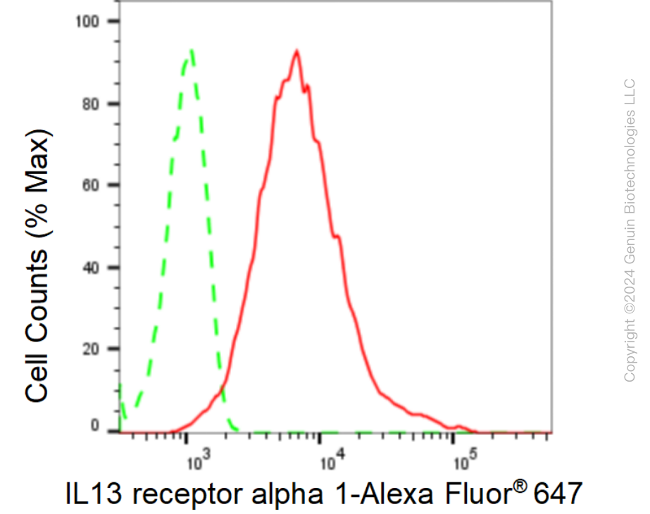Flow cytometric analysis of IL13 receptor alpha 1 expression in HepG2 cells using IL13 receptor alpha 1 antibody (Cat#62240, 1:2,000). Green, isotype control; red, IL13 receptor alpha 1.