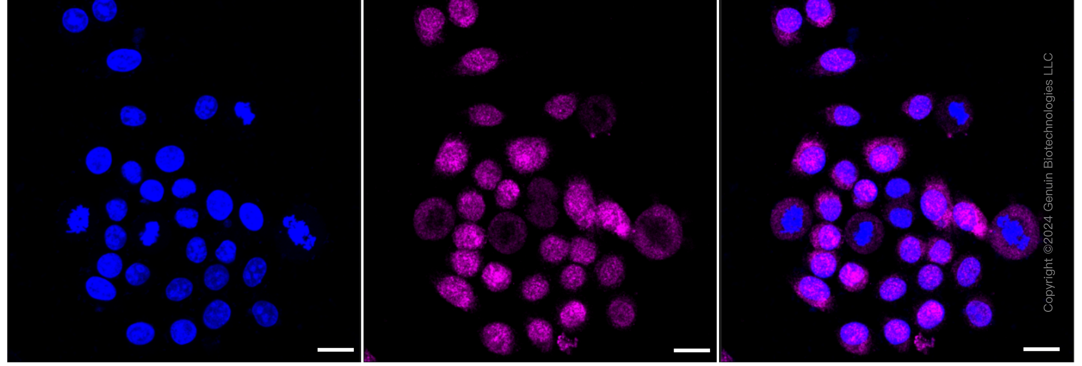 Immunocytochemical staining of Hela cells with anti-IL13 receptor alpha 1 antibody (Cat#62240, 1:1,000). Nuclei were stained blue with DAPI; IL13 receptor alpha 1 was stained magenta with Alexa Fluor® 647. Images were taken using Leica stellaris 5. Protein abundance based on laser Intensity and smart gain: Medium. Scale bar: 20 μm.
