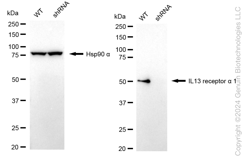 Western blotting analysis using anti-IL13 receptor α 1 antibody (Cat#62240). IL13 receptor α 1 expression in wild type (WT) and IL13 receptor α 1 shRNA knockdown (KD) HeLa cells with 20 μg of total cell lysates. Hsp90 α serves as a loading control. The blot was incubated with anti-IL13 receptor α 1 antibody (Cat#62240, 1:5,000) and HRP-conjugated goat anti-rabbit secondary antibody (Cat#201, 1:20,000) respectively. Image was developed using NaQ™ ECL Substrate Kit (Cat#716).