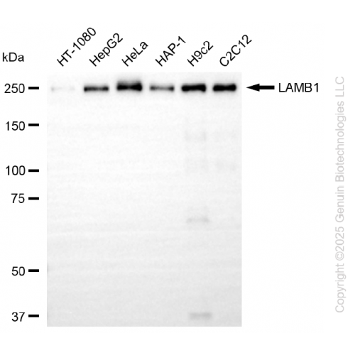 LAMB1 antibodyWestern blotting analysis using anti-LAMB1 antibody (Cat#65445). Total cell lysates (30 μg) from various cell lines were loaded and separated by SDS-PAGE. The blot was incubated with anti-LAMB1 antibody (Cat#65445, 1:5,000) and HRP-conjugated goat anti-rabbit secondary antibody (Cat#201, 1:20,000) respectively. Image was developed using NaQ™ ECL Substrate Kit (Cat#716).