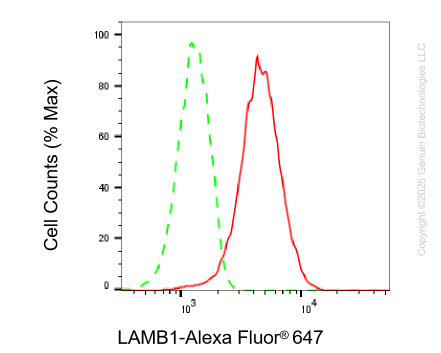 Flow cytometric analysis of LAMB1 expression in C2C12 cells using anti-LAMB1 antibody (Cat#65445, 1:2,000). Green, isotype control; red, LAMB1.