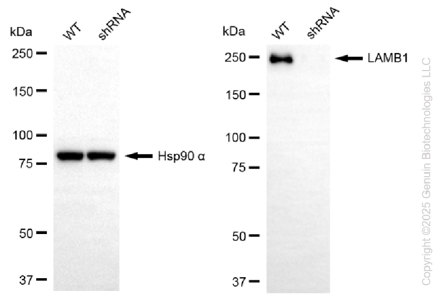Western blotting analysis using anti-LAMB1 antibody (Cat#65445). LAMB1 expression in wild-type (WT) and LAMB1 shRNA knockdown (KD) HeLa cells with 20 μg of total cell lysates. Hsp90 α serves as a loading control. The blot was incubated with anti-LAMB1 antibody (Cat#65445, 1:5,000) and HRP-conjugated goat anti-rabbit secondary antibody (Cat#201, 1:20,000) respectively. Image was developed using NaQ™ ECL Substrate Kit (Cat#716).