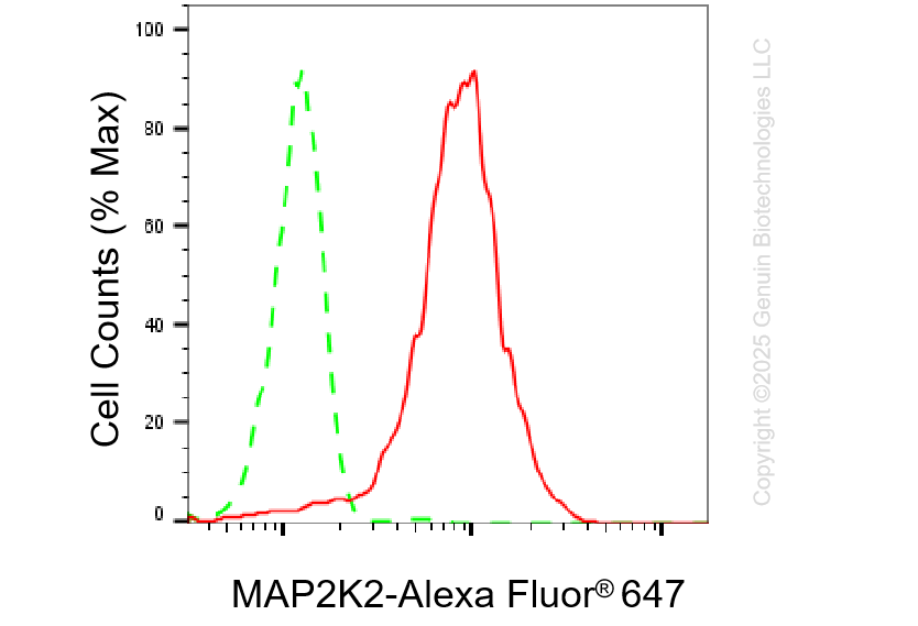 ![]() | Flow cytometric analysis of MAP2K2 expression in HepG2 cells using anti-MAP2K2 antibody (Cat#61587, 1:2,000). Green, isotype control; red, MAP2K2. |