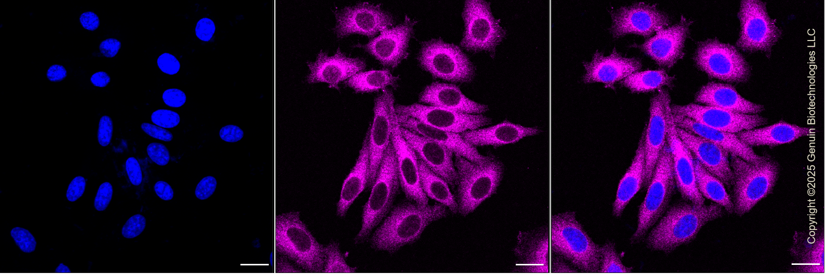 ![]() | Immunocytochemical staining of HepG2 cells with anti-MAP2K2 antibody (Cat#61587, 1:1,000). Nuclei were stained blue with DAPI; MAP2K2 was stained magenta with Alexa Fluor® 647. Images were taken using Leica stellaris 5. Protein abundance based on laser Intensity and smart gain: Medium. Scale bar, 20 μm. |