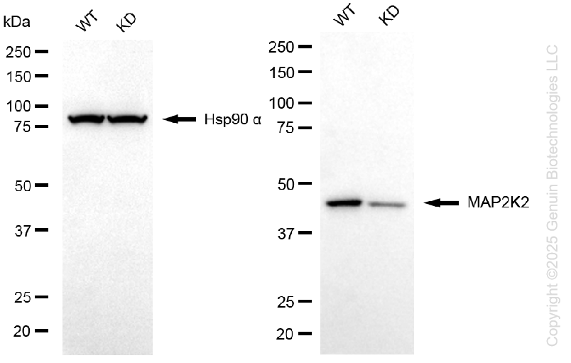 ![]() | Western blotting analysis using anti-MAP2K2 antibody (Cat#61587). MAP2K2 expression in wild-type (WT) and MAP2K2 knockdown (KD) 293T cells with 20 μg of total cell lysates. Hsp90 α serves as a loading control. The blot was incubated with anti-MAP2K2 antibody (Cat#61587, 1:5,000) and HRP-conjugated goat anti-rabbit secondary antibody (Cat#201, 1:20,000) respectively. Image was developed using NaQ™ ECL Substrate Kit (Cat#716). |