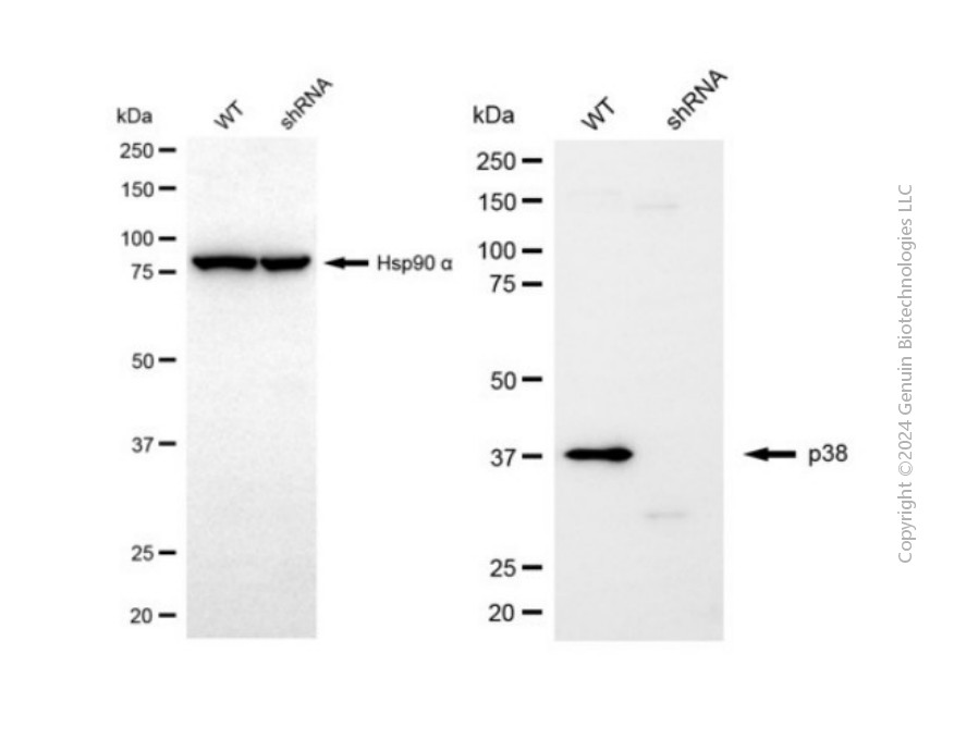 ![]() | Western blotting analysis using anti-p38 antibody (Cat#65006). p38 expression in wild-type (WT) and MAPK14 shRNA knockdown (KD) HT-1080 cells with 30 μg of total cell lysates. Hsp90 α serves as a loading control. The blot was incubated with anti-p38 antibody (Cat#65006, 1:2,500) and HRP-conjugated goat anti-rabbit secondary antibody (Cat#201, 1:20,000) respectively. Image was developed using FeQ™ ECL Substrate Kit (Cat#226). |