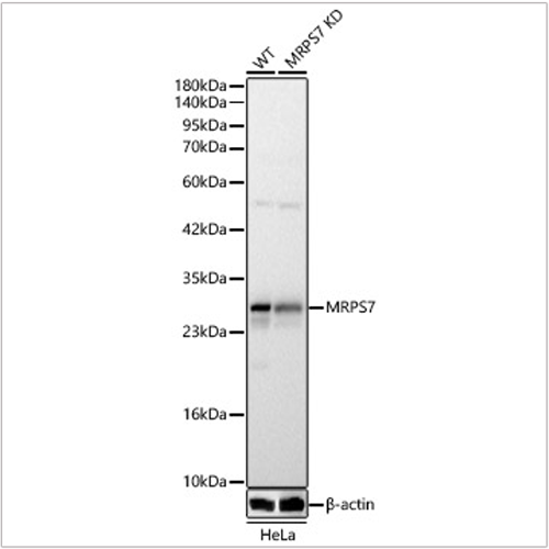 ![]() | Western blot analysis of lysates from wild type (WT) and MRPS7 knockdown (KD) HeLa cells using [KD Validated] MRPS7 Rabbit pAb (A24774) at 1:1000 dilution. Secondary antibody: HRP-conjugated Goat anti-Rabbit IgG (H+L) (AS014) at 1:10000 dilution.Lysates/proteins: 25 μg per lane. Blocking buffer: 3% nonfat dry milk in TBST. Detection: ECL Basic Kit (RM00020). Exposure time: 5s. |