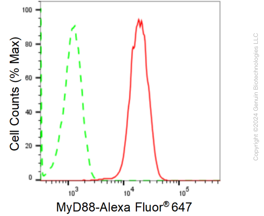 ![]() | Flow cytometric analysis of MyD88 expression in HAP-1 cells using anti-MyD88 antibody (Cat#62307, 1:2,000). Green, isotype control; red, MyD88. |
