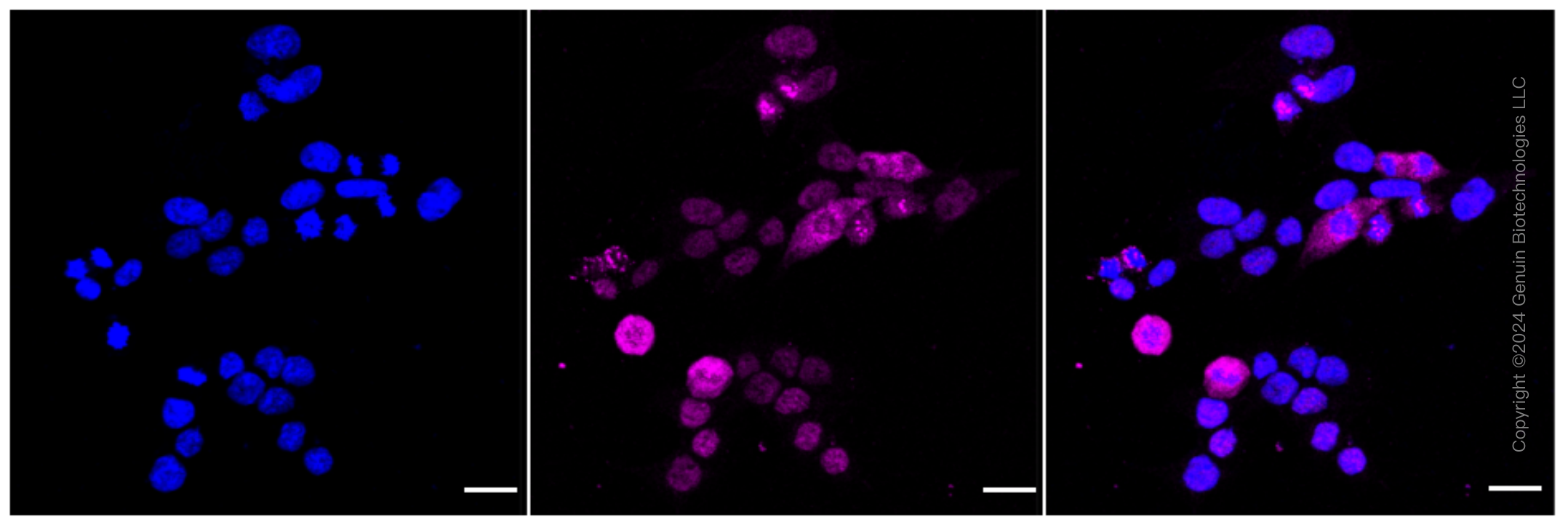 ![]() | Immunocytochemical staining of HAP-1 cells with anti-MyD88 antibody (Cat#62307, 1:1,000). Nuclei were stained blue with DAPI; MyD88 was stained magenta with Alexa Fluor® 647. Images were taken using Leica stellaris 5. Protein abundance based on laser Intensity and smart gain: High. Scale bar: 20 μm. |