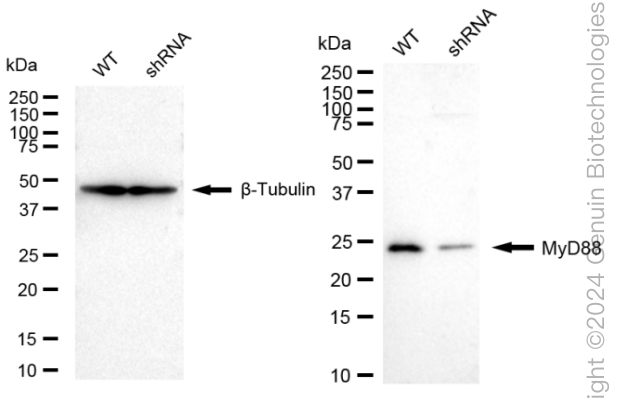 ![]() | Western blotting analysis using anti-MyD88 antibody (Cat#62307). MyD88 expression in wild type (WT) and MyD88 shRNA knockdown (KD) HT-1080 cells with 20 μg of total cell lysates. β-Tubulin serves as a loading control. The blot was incubated with anti-MyD88 antibody (Cat#62307, 1:5,000) and HRP-conjugated goat anti-rabbit secondary antibody (Cat#201, 1:20,000) respectively. Image was developed using anti-NaQ™ ECL Substrate Kit (Cat#716). |