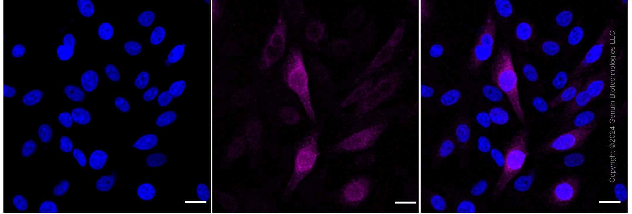 Immunocytochemical staining of HepG2 cells with anti-phospho-cyclin B1 (Ser126) antibody (Cat#63161, 1:1,000). Nuclei were stained blue with DAPI; Phospho-cyclin B1 (Ser126) was stained magenta with Alexa Fluor® 647. Images were taken using Leica stellaris 5. Protein abundance based on laser Intensity and smart gain: Medium. Scale bar: 20 μm.