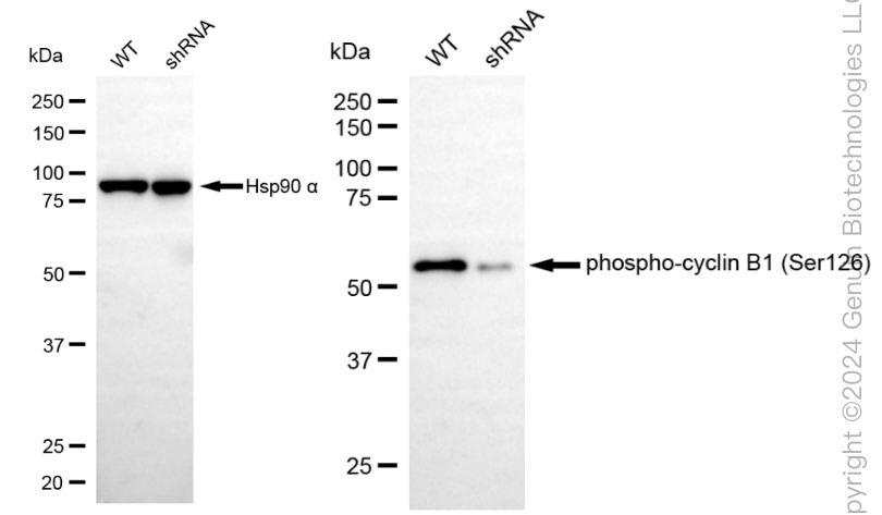 Western blotting analysis using anti-phospho-cyclin B1 (Ser126) antibody (Cat#63161). Phospho-cyclin B1 (Ser126) expression in wild type (WT) and CCNB1 shRNA knockdown (KD) HT-1080 cells with 20 μg of total cell lysates. Hsp90 α serves as a loading control. The blot was incubated with anti-phospho-cyclin B1 (Ser126) antibody (Cat#63161, 1:5,000) and HRP-conjugated goat anti-rabbit secondary antibody (Cat#201, 1:20,000) respectively. Image was developed using NaQ™ ECL Substrate Kit (Cat#716).
