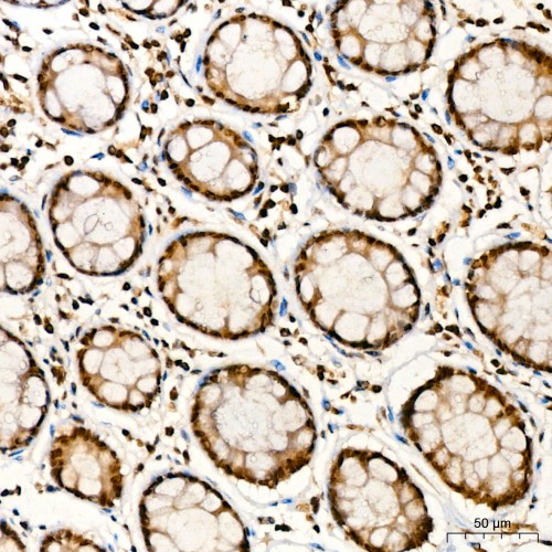 ![]() | Immunohistochemistry analysis of paraffin-embedded Human colon tissue using [KD Validated] TFEB Rabbit pAb (A7311) at a dilution of 1:100 (40x lens). High pressure antigen retrieval was performed with 0.01 M citrate buffer (pH 6.0) prior to IHC staining. |