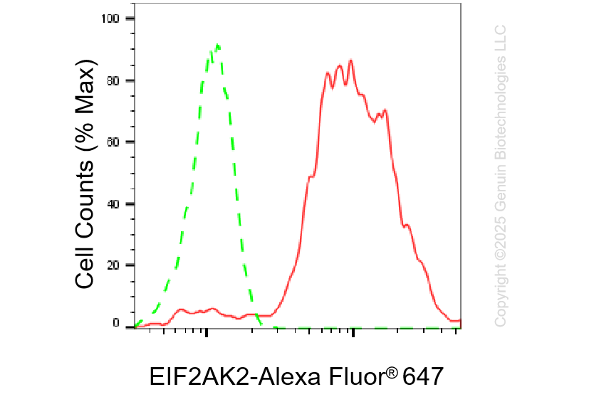 ![]() | Flow cytometric analysis of EIF2AK2 expression in HepG2 cells using anti-EIF2AK2 antibody (Cat#71234, 1:2,000). Green, isotype control; red,EIF2AK2 . |