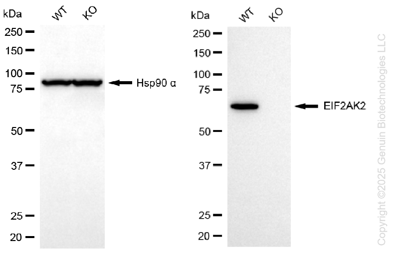 ![]() | Western blotting analysis using anti-EIF2AK2 antibody (Cat#71234). EIF2AK2 expression in wild-type (WT) and EIF2AK2 knockout (KO) 293T cells with 20 μg of total cell lysates. Hsp90 α serves as a loading control. The blot was incubated with anti-EIF2AK2 antibody (Cat#71234, 1:5,000) and HRP-conjugated goat anti-rabbit secondary antibody (Cat#201, 1:20,000) respectively. Image was developed using NaQ™ ECL Substrate Kit (Cat#716). |