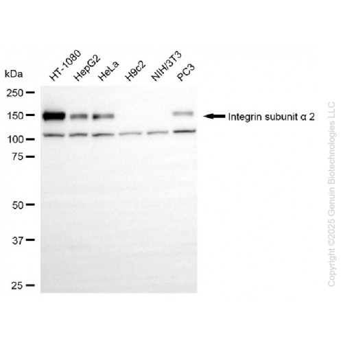 ![]() | Western blotting analysis using anti-Integrin subunit alpha 2 antibody (Cat#71145). Total cell lysates (30 μg) from various cell lines were loaded and separated by SDS-PAGE. The blot was incubated with anti-Integrin subunit alpha 2 antibody (Cat#71145, 1:5,000) and HRP-conjugated goat anti-rabbit secondary antibody (Cat#201, 1:20,000) respectively. Image was developed using NaQ™ ECL Substrate Kit (Cat#716). |