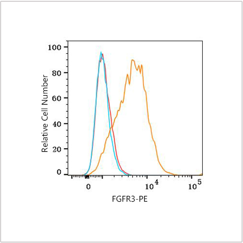 ![]() | Flow cytometry: 1×10^6 A-431 cells (negative control,left) and K-562 cells (right) were surface-stained with PE Rabbit anti-Human FGFR3 mAb (A27212,5 μl/Test,orange line) or PE Rabbit IgG isotype control (A24172,5 μl/Test,blue line). Non-fluorescently stained cells were used as blank control (red line). |