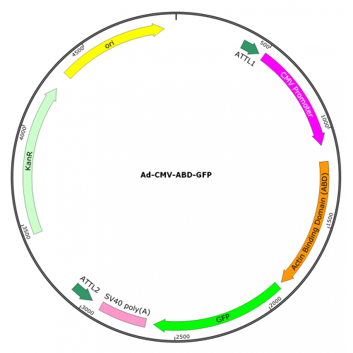 E1/E3 deletion, type 5 adenovirus with a GFP fused at the C-terminus of actin binding domain. This fused GFP can be used as a tool for investigating the structural dynamics of the cytoskele of living cells, overcoming the disadvantage of phalloidin which can only stain the fixed cells.