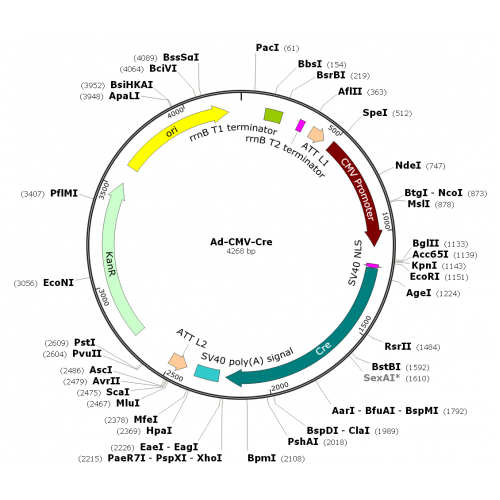 Cre Recombinase is a Type I topoisomerase from bacteriophage P1 that catalyzes the site-specific recombination of DNA between loxP sites. loxP is a 34 bp DNA sequence at which confers directionality. Cre recombinase is used as a tool to genetically modify genes, such as to delete a segment of DNA flanked by LoxP sites in cells or experimental animals. This pre-packaged adenovirus over-expresses Cre recombinase under CMV promoter. Ready to use format.