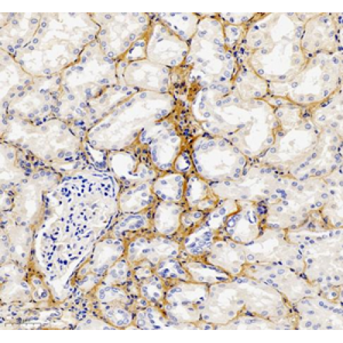 Immunohistochemistry of paraffin embedded human kidney using collagen I (GB11022-3) at dilution of 1:800 (200x lens)