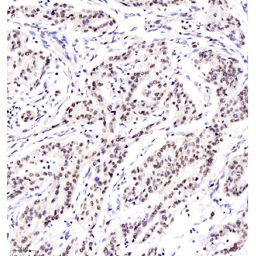 | IHC analysis of c-fos (GB11069). Sample: Human breast cancer (Paraffin), 4% PFA (G1101) 12-24h. Antigen retrieval: Citrate buffer (pH 6.0) (G1201),98°C,20 min. Blocking buffer: 3% BSA in PBS (GC305010), RT, 30min. Primary antibody: 1: 600, 4°C overnight. Secondary antibody: HRP Goat Anti-Rabbit lgG (GB23303), 1: 200 RT 1h. |
