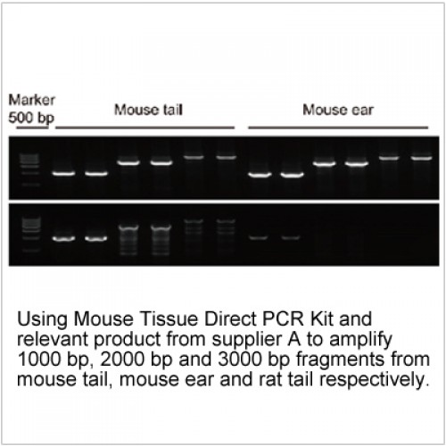 Using Mouse Tissue Direct PCR Kit and relevant product from supplier A to amplify 1000 bp, 2000 bp and 3000 bp fragments from mouse tail, mouse ear and rat tail respectively. The result showed that Mouse Tissue Direct PCR Kit has better specificity and success rate.