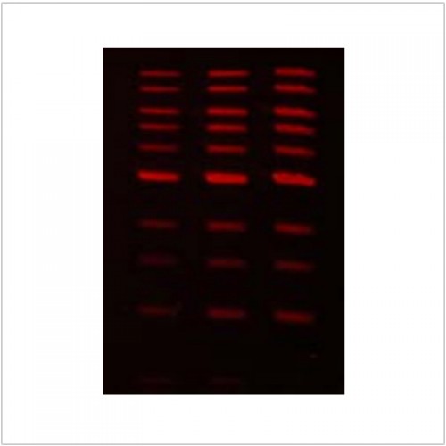 LiGreen™ Red DNA Gel Stain is a sensitive, and stable fluorescent nucleic acid stain designed to replace the highly toxic ethidium bromide (EtBr) for detection of dsDNA, ssDNA or RNA in agarose and polyacrylamide gels. This single stain gives more sensitive detection of dsDNA, ssDNA and RNA than EtBr. Gels can be post-stained or alternatively the stain can be added to agarose gels during gel casting. LiGreen™ Red has similar excitation and emission spectra with EtBr, and is compatible with EtBr imaging system.